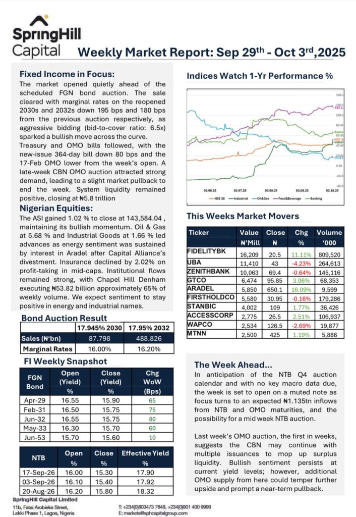 Fixed Income in Focus: The week opened with a c.₦956bn liquidity surplus. The CBN issued about ₦827bn in OMO bills across tenors, clearing in a 21.73%–22.8% yield range on solid participation. Ahead of the mid-week NTB sale, profit-taking tilted bills bearish, with the 8-Oct trading near 15.60%. At auction, the long end cleared c.+37bps versus […]