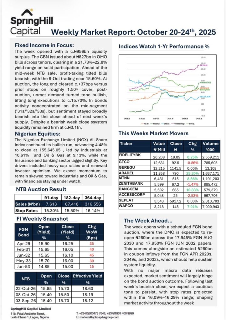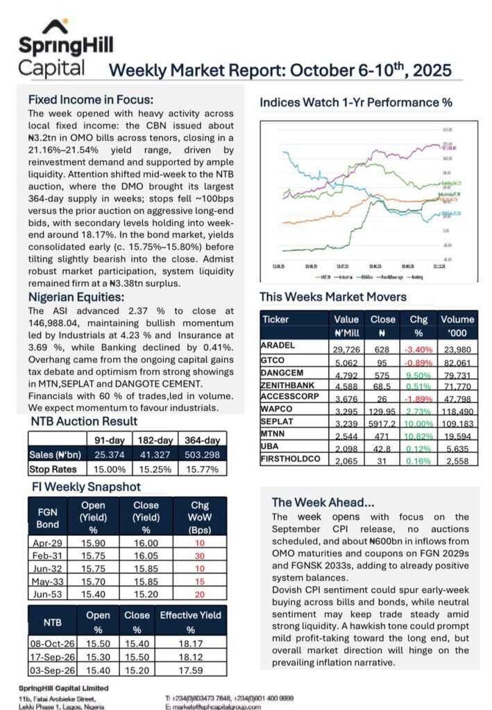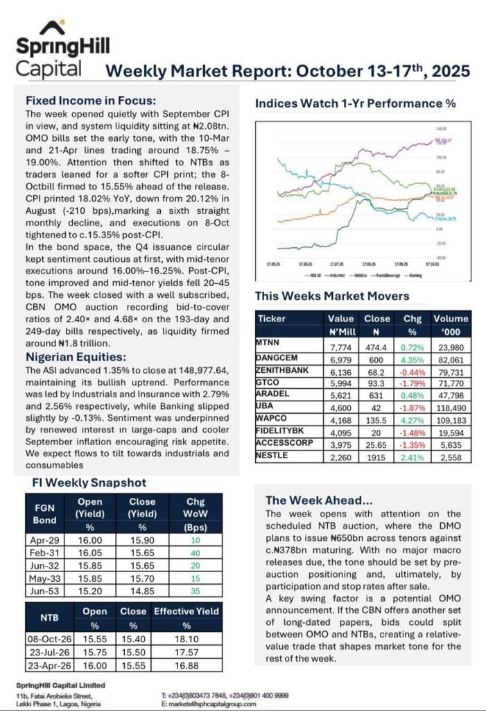 Fixed Income in Focus: The week opened quietly with September CPI in view, and system liquidity sitting at ₦2.08tn. OMO bills set the early tone, with the 10-Mar and 21-Apr lines trading around 18.75% – 19.00%. Attention then shifted to NTBs as traders leaned for a softer CPI print; the 8-Octbill firmed to 15.55% ahead […]