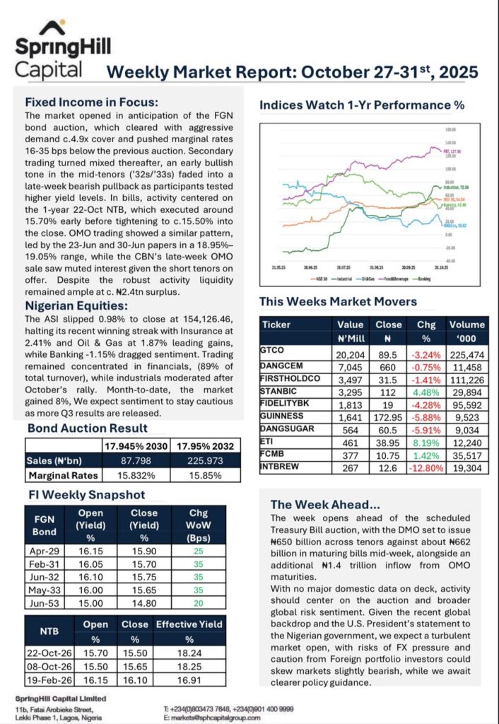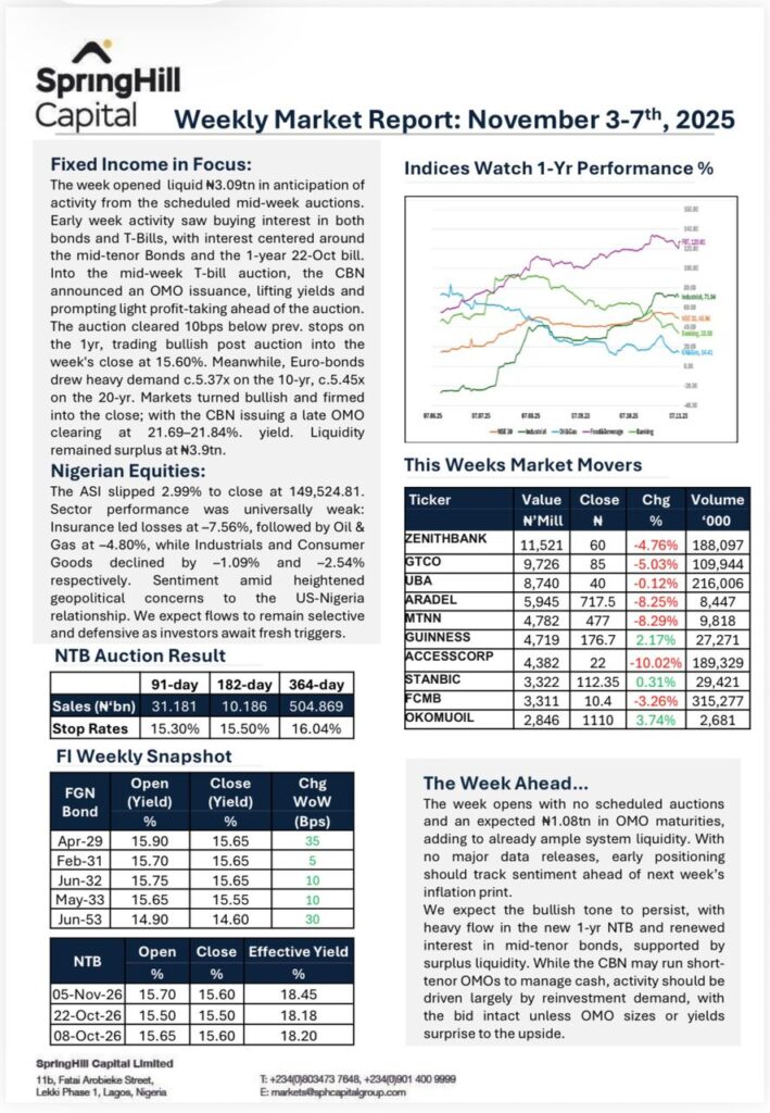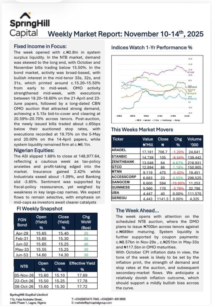 Fixed Income in Focus: The week opened quietly ahead of the October inflation print, with system liquidity surplus at c.₦1.3tn. Trading opened with mid-tenor bonds rallying after headline inflation fell to 16.08% (-197bps m/m), though profit-taking later in the week saw yields retrace by c.25bps into the close. In the T-bills market, activity was bullish […]