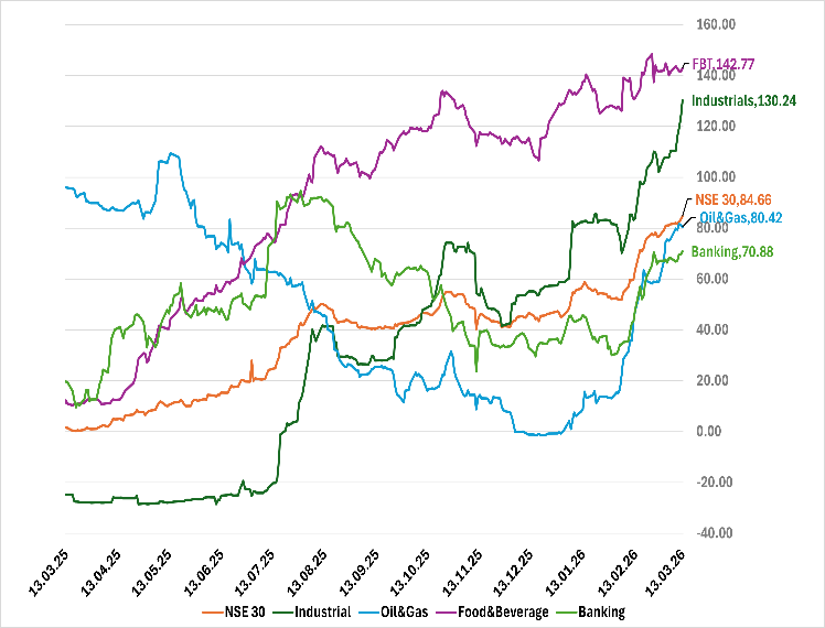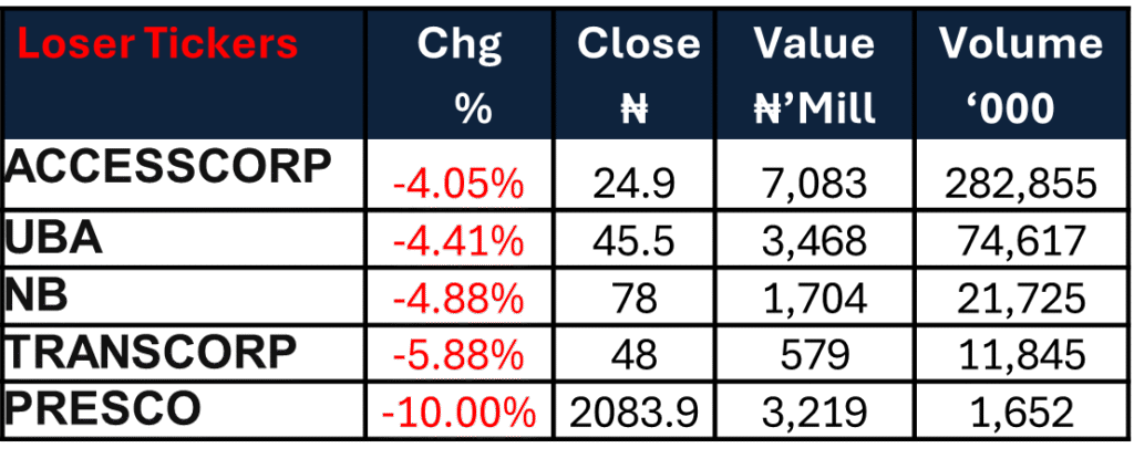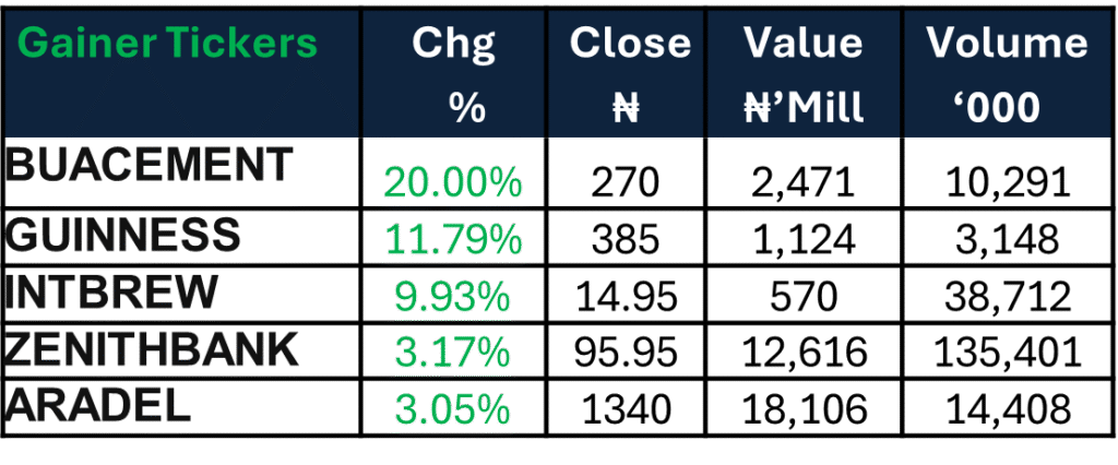 The ASI gained 0.73% WoW to close at 198,407.30, extending the market’s advance. Industrial Goods led sector performance (+5.73%), followed by Oil & Gas (+1.50%), while Insurance (-4.59%) lagged. The move was supported by strong price appreciation in BUA Cement, INTBREW and ARADEL alongside gains in select consumer and healthcare counters.